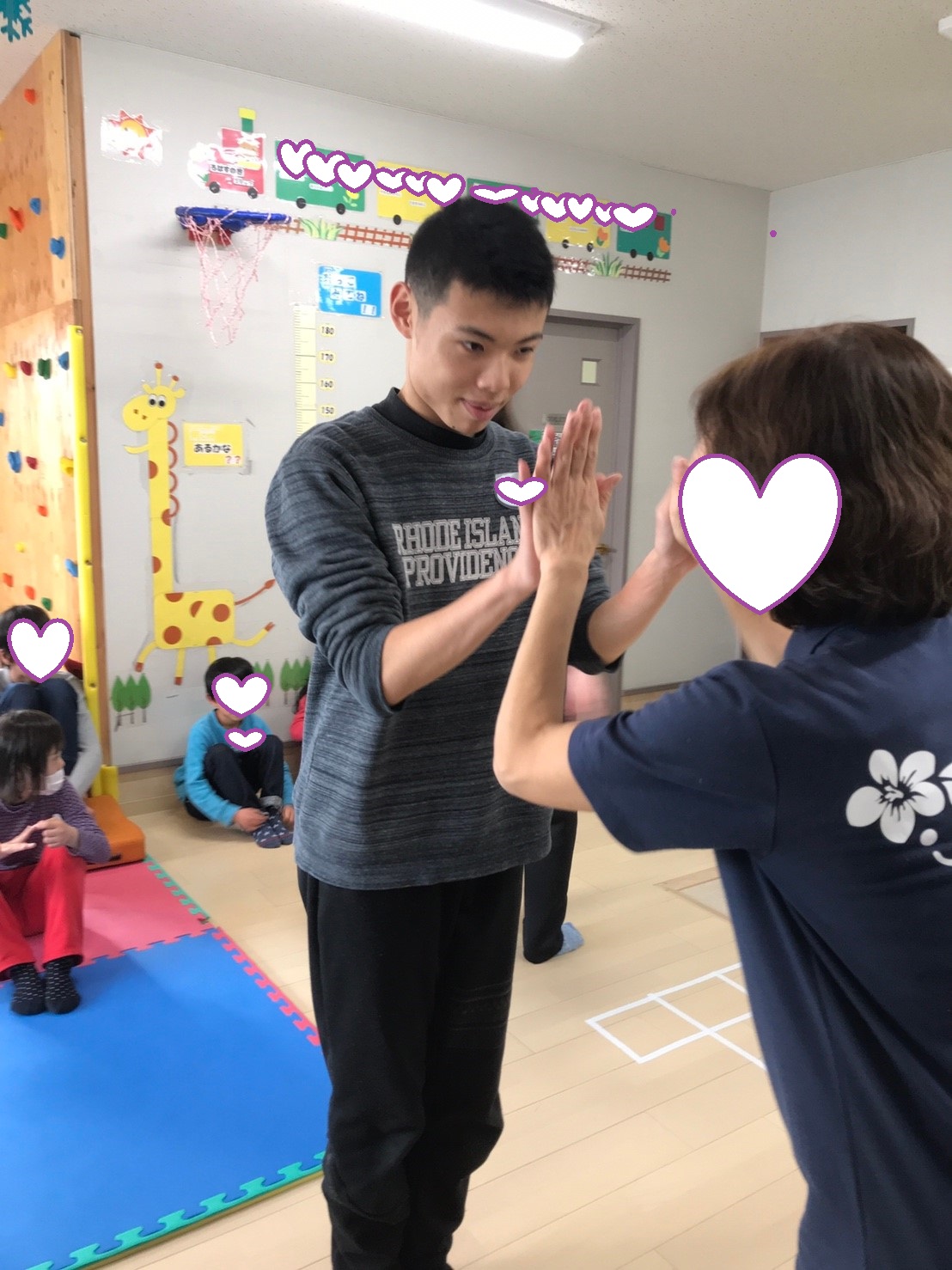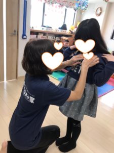 先生に名前を呼ばれ、名札を付けてもらっています(^^♪
