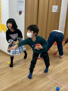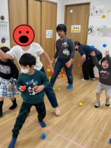 赤鬼チームと青鬼チームに分かれて玉入れ競走!